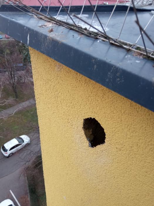 Poškozená omítka, díry od ptactva, strakapoud a datel.