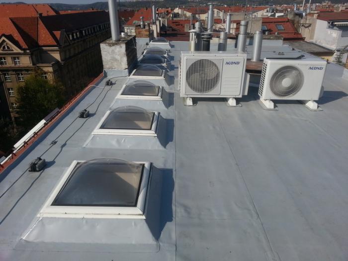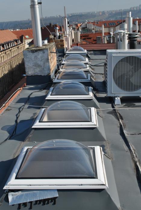 Po opakujících se problémech s protékáním se majitel bytového domu rozhodl vyměnit starou falcovanou krytinu za PVC krytinu Alkorplan. Realizace na jaře 2013.